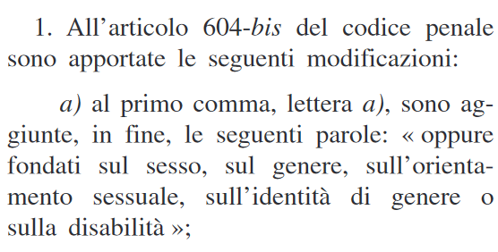 Matteo Renzi nel corso della sua diretta Facebook di ieri ha ribadito di come bisogna trovare un compromesso se si vuol mandare avanti la legge. Un po' furbescamente ha ribadito come i suoi, al Senato, daranno sicuramente il voto e che i malumori nascano nel Partito Democratico (quando, invece, il Partito Democratico chiede non solo di non usare il voto segreto, ma voterà in maniera compatta). A mancare, invece, sembrano essere proprio i voti del leader di Italia Viva che in cuor suo sta cercando di diventare il trait d'union tra le destre e il centro sinistra. Viene così proprosto il DDL Scalfarotto, presentato nel 2018 che vede fra i firmatari, per altro, anche il deputato Zan. Il senatore Renzi per altro vanta il suddetto disegno di legge come migliore di quello attuale, ma vediamolo nel dettaglio nelle due immagini a confronto (prima foto DDL Zan, seconda foto DDL Scalfarotto):